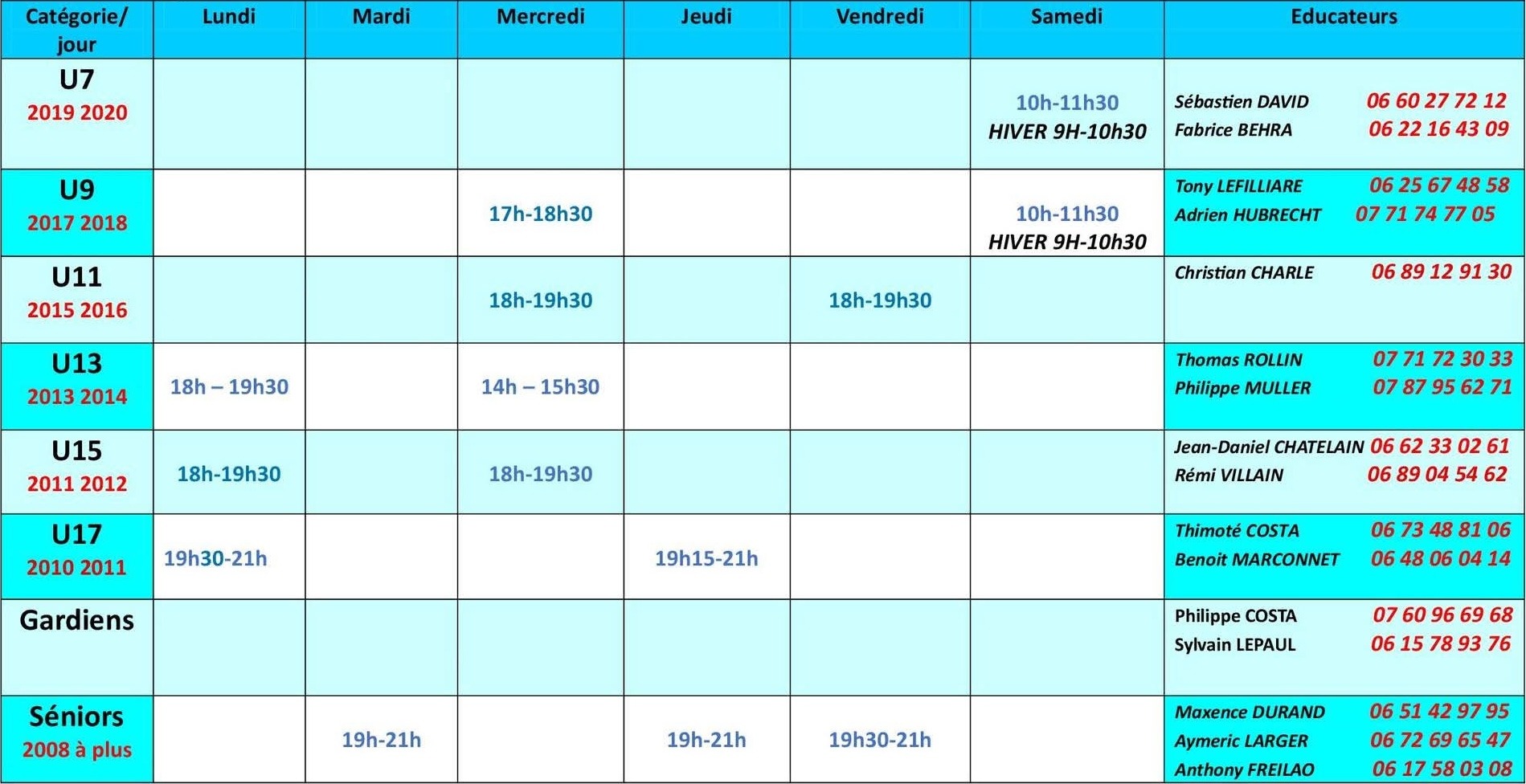 Planning des entrainements